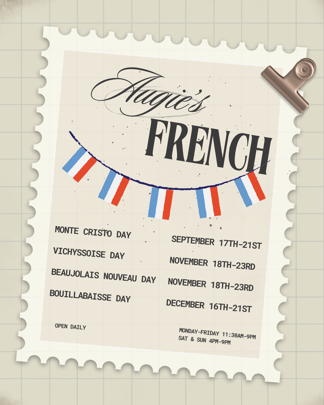 We anticipate many impactful conversations within Augie's French, and we warmly invite you to join us daily: Monday-Friday for lunch, Happy Hour, or dinner, and Saturday-Sunday for dinner service. Enjoy your experience in the main dining room, at the bar, on the mezzanine, or on our charming patio.